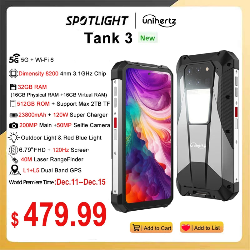 Unihertz Tank 3 8849 120W 5G Waterproof android 13 32GB 512GB 23800 mAh 6.79" FHD+ 120Hz 200MP Dimensity 8200 Rangefinder Global